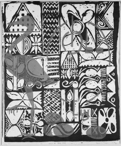 The influx of European clothing materials in the mid 1930s did give rise to new techniques of resist dyeing including the practice of hand-painting designs on the cloth with cassava starch paste prior to dyeing known as “Adire Eleko”. This was also a means of cottage-industry income for Moslem women who were rarely permitted to leave their homes. Another method was to use sewn raffia, sometimes in combination with tied sections, while other cloths were simply folded repeatedly and tied or stitched in place. The basic shape of the cloth is that of two pieces of shirting material stitched together to create a women’s wrapper cloth. Examples of popular designs are the jubilee pattern (produced for the King George V and Queen Mary 1935), Olokun (goddess of the sea), Ibadandun (Ibadan is sweet).